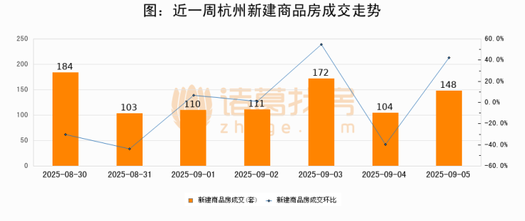 根据杭州市住房保障和房产管理局数据显示,2025年09月05日杭州新建商品房成交148套,较昨日增加44套,环比上涨42.3%。近一周杭州新建商品房日均成交134套。09月05日单日成交148套,高于近一周平均水平10.4%。