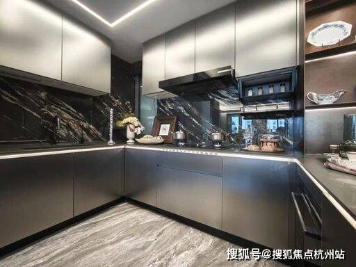 :博世四件套、铂浪高水槽龙头、康丽根净水器,岩板墙面 + 石英石台面,餐边柜为交付标准。