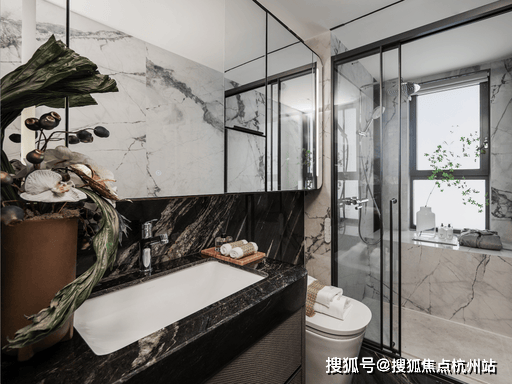 :科勒智能卫浴四件套,主次卫同标,岩板台面 + 防滑大理石地面,质感与实用兼具。