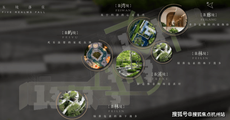 规划了“翡色五境”五大空间氛围,匠造融入时光、人文海派、自然与艺术、家庭与邻里的“四轴、三园、五区、一所”四大功能空间。