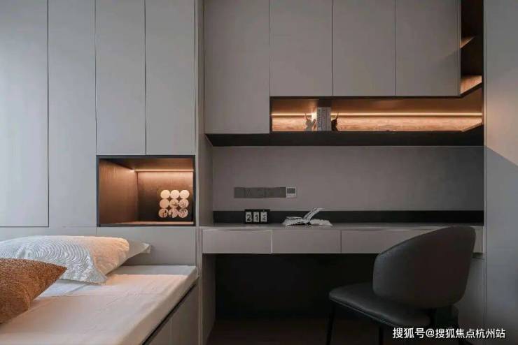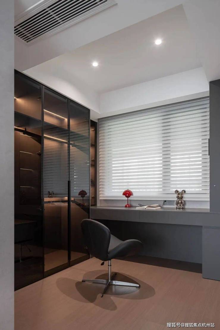 书房是自我对话的留白之地,浅灰柜体与书桌一体化延伸,玻璃柜门衣柜通透不压抑,百叶帘将自然光柔化后洒在桌面。无冗余装饰,只留书籍与器物,在极简线条里安放专注与沉思。