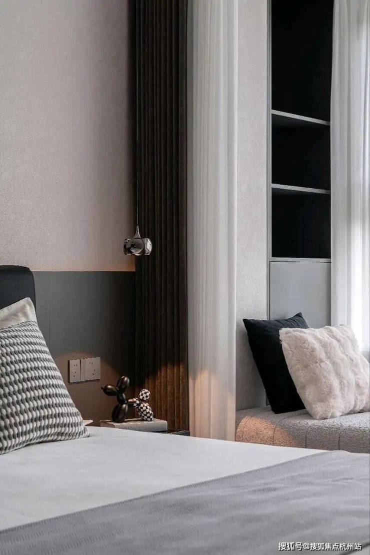 飘窗与开放格架收纳起日常细碎,在低饱和色调里,营造出包裹感极强的安眠氛围,让喧嚣止于门外。