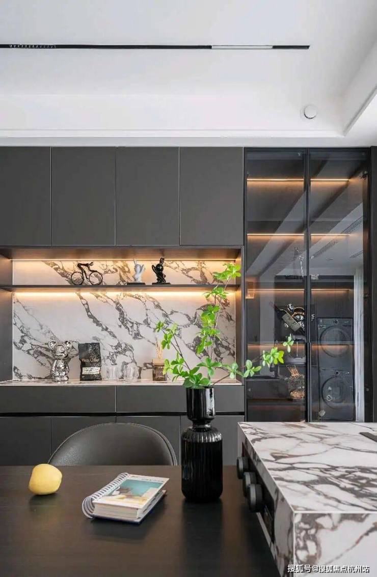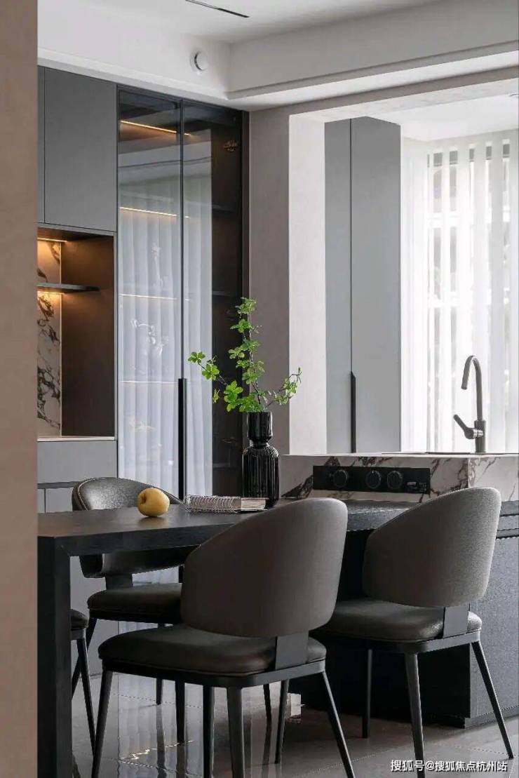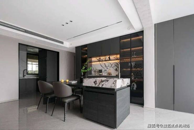 餐厅与岛台:中岛与餐桌一体化设计,黑色岩板台面承载烟火与社交,酒柜玻璃门藏起生活琐碎,大理石背墙成为视觉锚点。一器一物皆在黑白灰的秩序里,演绎“少即是多”的美学哲学。