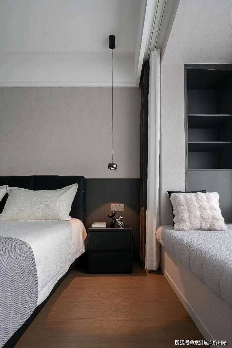 主卧以深浅撞色划分功能区,下半墙炭黑与上半墙高级灰温柔过渡,黑色皮床成为空间重心,线性灯带与悬浮床头柜弱化厚重感。