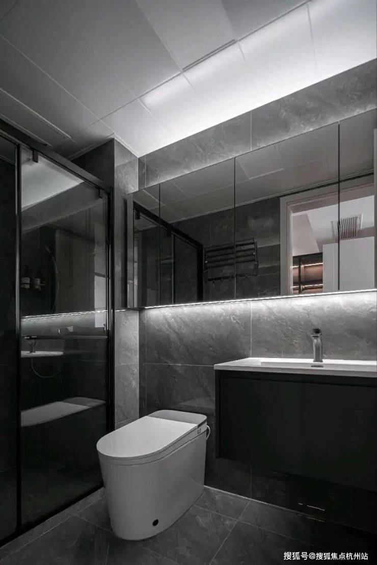 卫浴间以深灰石纹砖铺陈,黑色五金与悬浮台盆呼应整体调性,玻璃淋浴房划分干湿区,线性灯带在石纹肌理里流动,让洗漱时刻也充满仪式感。