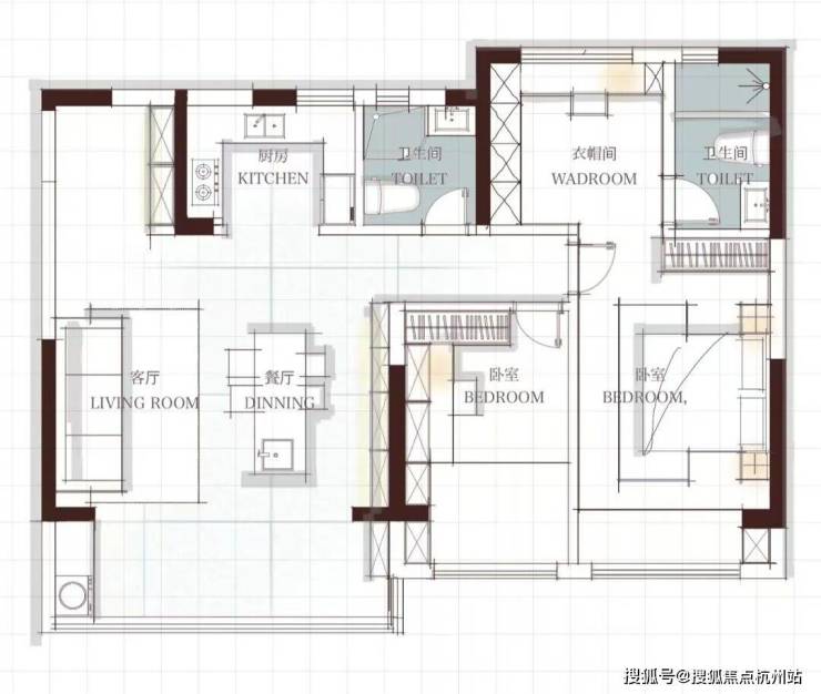 ❶. 原始图空间边界模糊,方案明确划分出客厅、餐厅、厨房、双卫、双卧+衣帽间,动线互不干扰。