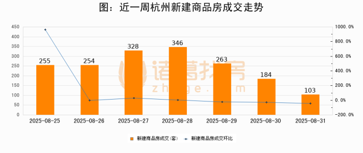 根据杭州市住房保障和房产管理局数据显示,2025年08月31日杭州新建商品房成交103套,较昨日减少81套,环比下降44%。近一周杭州新建商品房日均成交248套。08月31日单日成交103套,低于近一周平均水平58.5%。