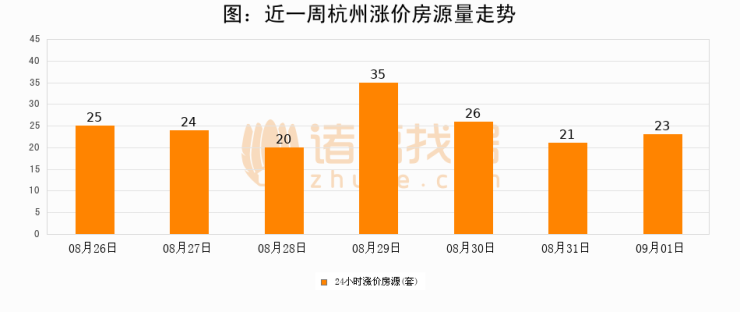 根据诸葛找房数据显示,杭州24小时涨价房源量为23套,较08月31日增加2套,环比上涨9.5%。与此同时,涨价房源占比小幅扩大,业主信心有所提升。