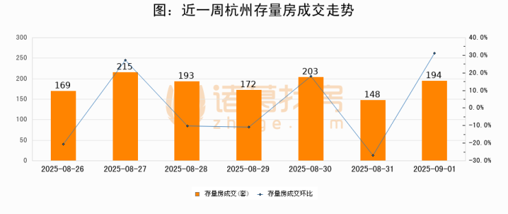 从存量房来看,2025年09月01日杭州存量房单日成交194套,比昨日增加46套,环比上涨31.1%。从近一周存量房成交来看,杭州存量房日均成交套数为184套,09月01日单日成交194套,高于近一周平均水平5.4%。