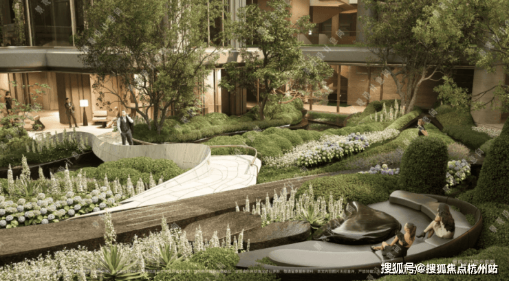 在全域抬板约4米的基础上,项目又下挖,形成罕见垂直落差。依托这一独特地形,项目打造“沿街古树花园+板上浮空花园+板下流石花园”的多层立体景观体系。