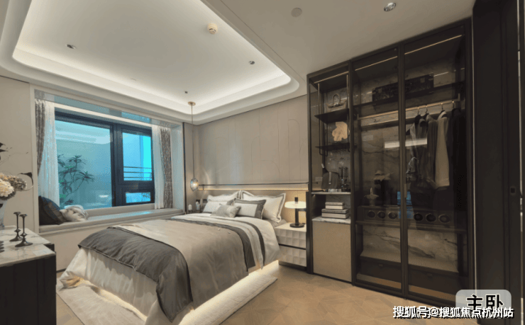 主卧套房设计,皮革造型的床背景墙也是交付标准,台盆为唯宝(或同等档次)、龙头则为科勒(或同等档次)复古龙头,马桶为高仪智能马桶(或同等档次)。
