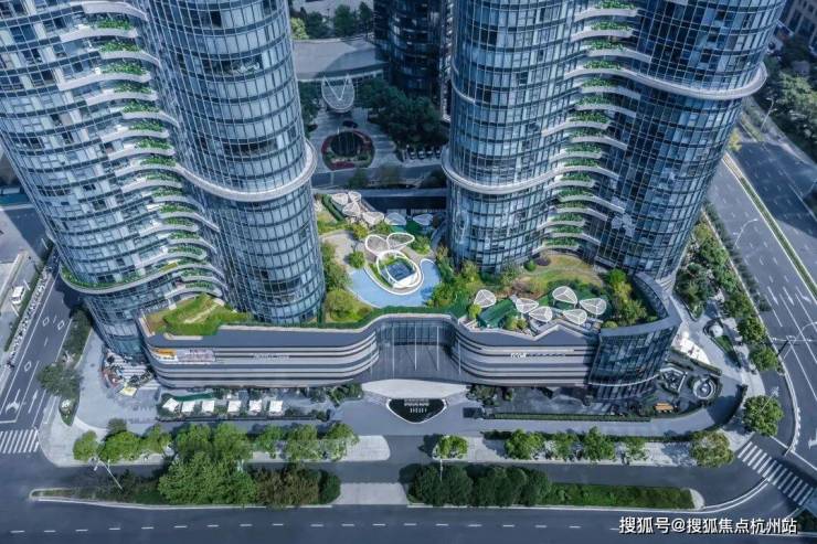 维持建筑原有结构的弧线美感,并将其由鸟瞰视角的美延续至人视可见的街景。建筑形体如两座耸立秀美的茶山,散发杭州特有的气质。山形建筑之下,裙楼屋顶被整体设计为开放式花园,使建筑、绿植、公共景观相互串联,成为隐藏在城市中的桃源绿谷,为使用者提供独特的空间体验。