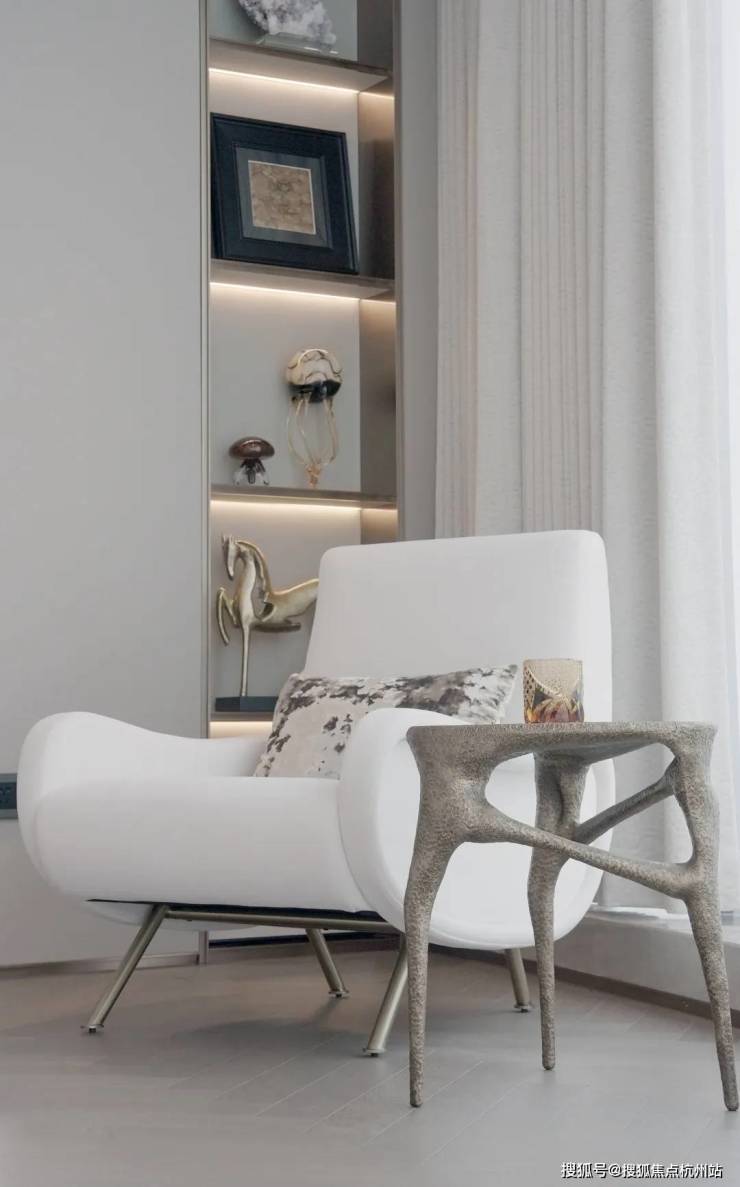 约450㎡“香奈儿”西边套,将原本多见于餐桌和墙面的白金沙奢石,漫铺于双厅地面之上。浅淡得宜的洁白,温润如玉的蜜色,将空间衬得时髦优雅。能眺望钱江两岸的梦幻天际线,“宇宙中心”奥体尽收眼底,也能俯瞰城市霓虹,车水马龙就在脚下。整个中心的璀璨世界定格在落地窗前,像一张巨幅明信片。