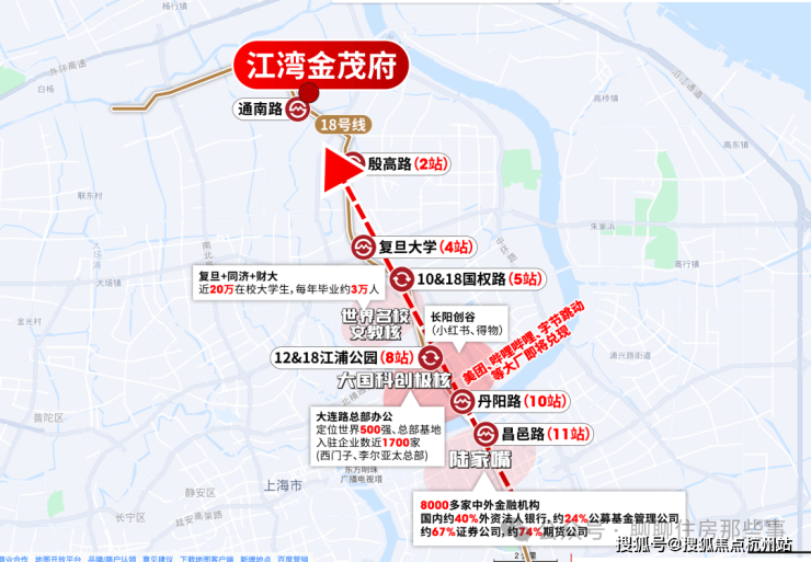 地铁上盖(18 号线通南路站):1 站新江湾、4 站复旦、5 站五角场、11 站陆家嘴,高效串联文教、科创、金融核心。