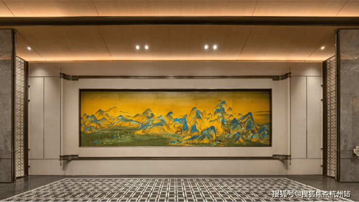 穿越门厅,九米巨幅《千里江山图》非遗漆画豁然呈现,天然大漆历经千道工序,再现青绿山河的壮丽磅礴,昭示着“归家,便是走入一幅传世名画”的崇高礼序。