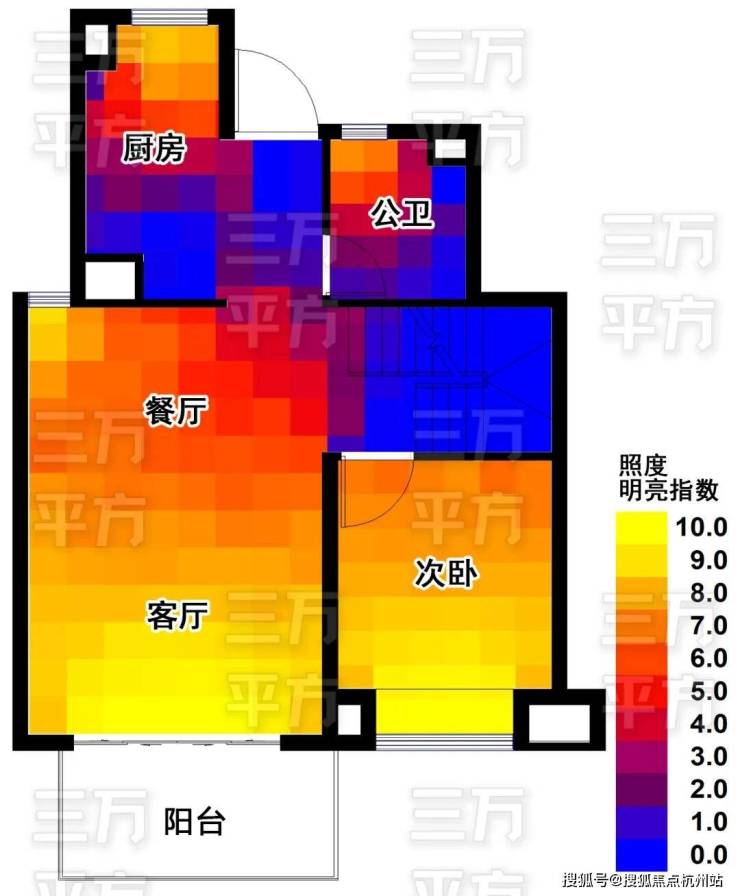 约3.2米层高,采光极好。三万平方也做了专业的采光分析,如下图所示,颜色代表亮度,黄色最亮红色一般蓝色最暗。可以看到在白天,主要房间靠自然光线就可以很明亮,幸福感立涨25%。