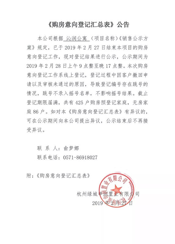 今天,绿城建发沁园公布了意向登记汇总。公告显示,本次登记人数达425户,其中无房家庭86户,中签率29.4%。