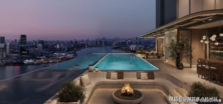 ② 三面全江视野 + 多露台体系:客餐厅向外延伸出两个大露台;东侧还有超大露台,并且配置了露天泳池,能把江景与城市界面直接变成日常生活的一部分。