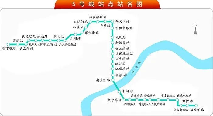 5号线途径杭州多个板块,从未来科技城过蒋村、途径老城区、桥西、运河、一路南下到望江新城、穿江而过到达滨江、一直到萧山南站、新塘。5号线的跨度是其它线路无法相比的。