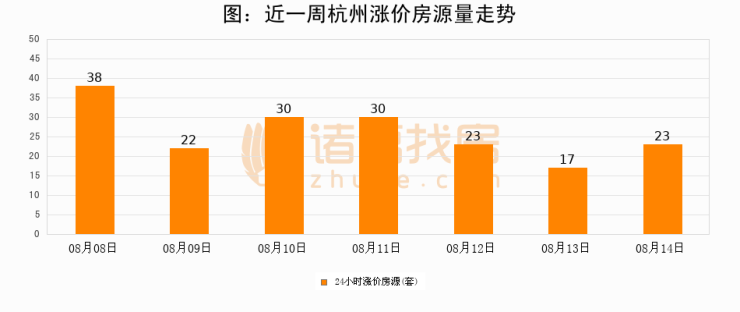 根据诸葛找房数据显示,杭州24小时涨价房源量为23套,较08月13日增加6套,环比上涨35.3%。与此同时,涨价房源占比小幅扩大,业主信心有所提升。