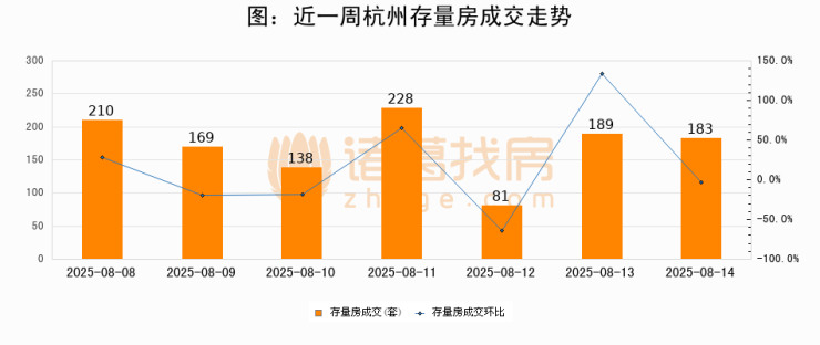 从存量房来看,2025年08月14日杭州存量房单日成交183套,比昨日减少6套,环比下降3.2%。从近一周存量房成交来看,杭州存量房日均成交套数为171套,08月14日单日成交183套,高于近一周平均水平7%。