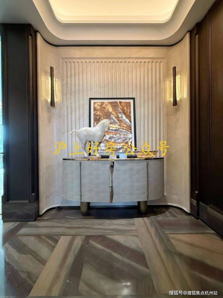 例如入户玄关铺设有“石材皇后”鱼肚印象”,这种级别的奢石在很多顶豪项目中通常仅作局部镶嵌