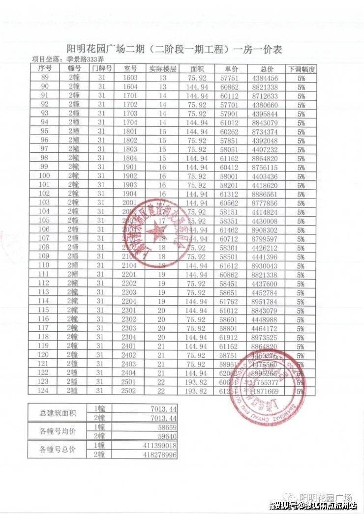 一房一价表如下