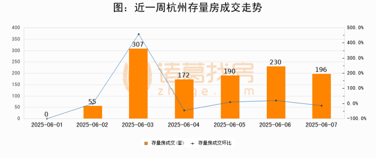 从存量房来看,2025年06月07日杭州存量房单日成交196套,比昨日减少34套,环比下降14.8%。从近一周存量房成交来看,杭州存量房日均成交套数为164套,06月07日单日成交196套,高于近一周平均水平19.5%。