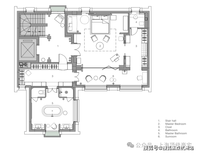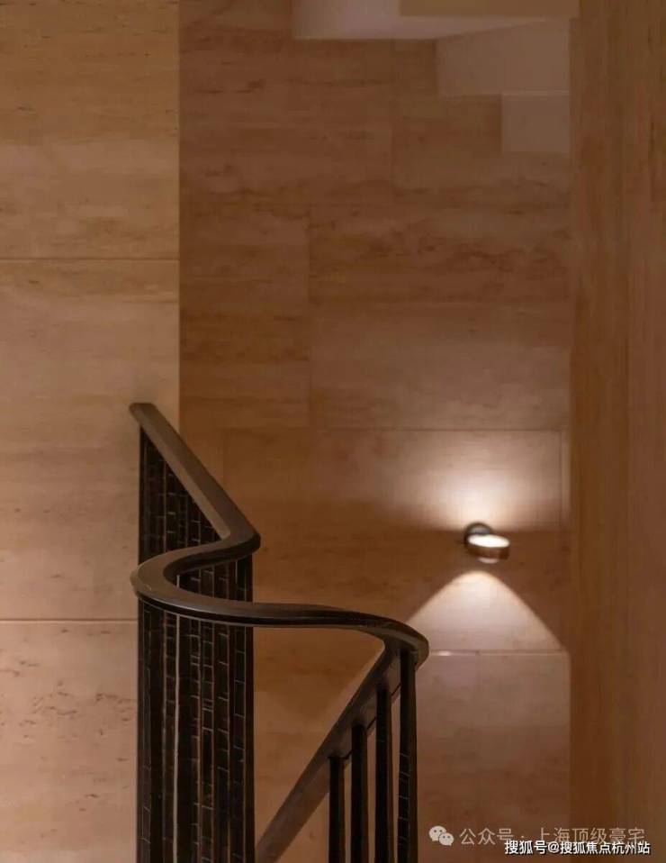 深铜色的栏杆和扶手融合传统与现代语汇,演变出一种当代型态,与现代白色洞石相映成趣,营造出优雅纯粹的意境。