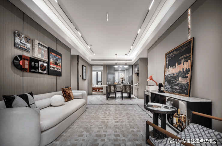 餐客厨一体化设计,进一步放大了空间感,层高约3m,客厅的建筑面宽约3.4m,整个餐客厅建筑面积约22㎡,包括中央空调、地暖和新风三大件都贴心配齐,餐厅区域的餐边柜也是交付标准。