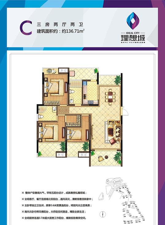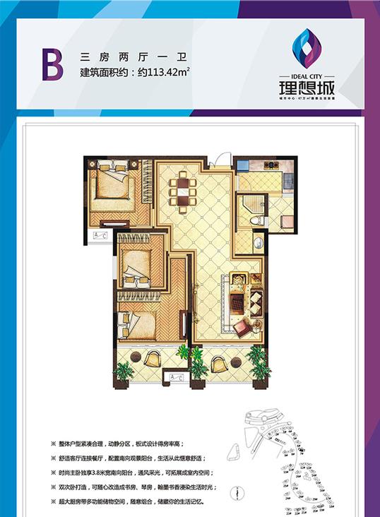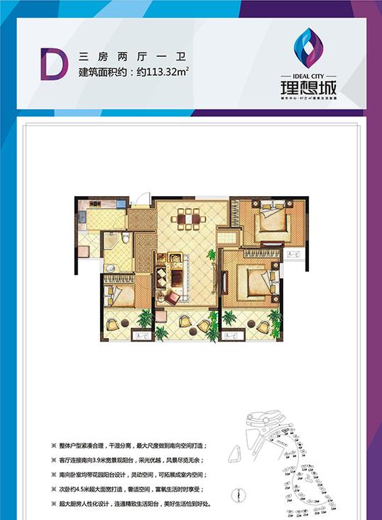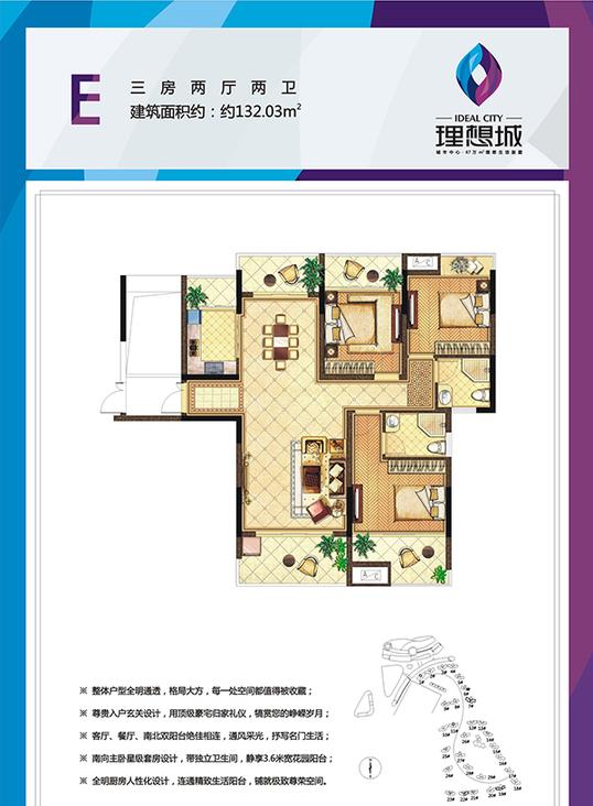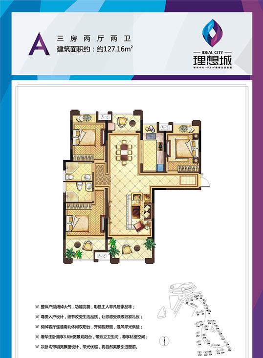 理想城位于滨江新区组团核心区,在此区域范围内,区政府、行政事业部门、医院、中小学、城市公园一应俱全,配套极其完善;项目用地北侧赣江大道和东侧华能大道为城市交通主干道,赣江大道,华能大道交通流量大,给商业和整体项目带来了良好的机会。此外,理想城也位于城市重点配套区,周边规划了丰富的商业配套设施,商住氛围浓厚,具有良好的开发优势与潜力。 在总体布局上,根据本项目有农贸市场、电子数码城、酒店、高层公寓、电子交易市场、单元式住宅、沿街商铺、高层住宅及相关配套各部分的功能,设计中将农贸市场布置在A1地块,这样既独立分区又与居住区联系紧密,为人们的生活提供了极大的便利。考虑到北面和东面是等级较高的城市主干道,电子数码城结合电子商务公寓集中分布于用地北侧沿赣江大道路段、将酒店分布于东侧沿华能大道路段,将电子交易市场分布于西侧沿和气路路段,设计有内部的商业步行街形成了复合的商业街模式,为购物休闲娱乐提供了丰富的环境和线索,引领着一种新的的商业模式与潮流。高层住宅布置在A2-2#居住用地地块和A3地块内,A2-2#居住用地地块高层住宅设计为沿周边布置以获得的庭院景观,A3地块高层住宅设计为沿周边式布置与中间楼王点式布置的模式创造出了交融、渗透、对话的空间,提供人们在小区内活动、休闲、娱乐和邻里沟通交流的空间。