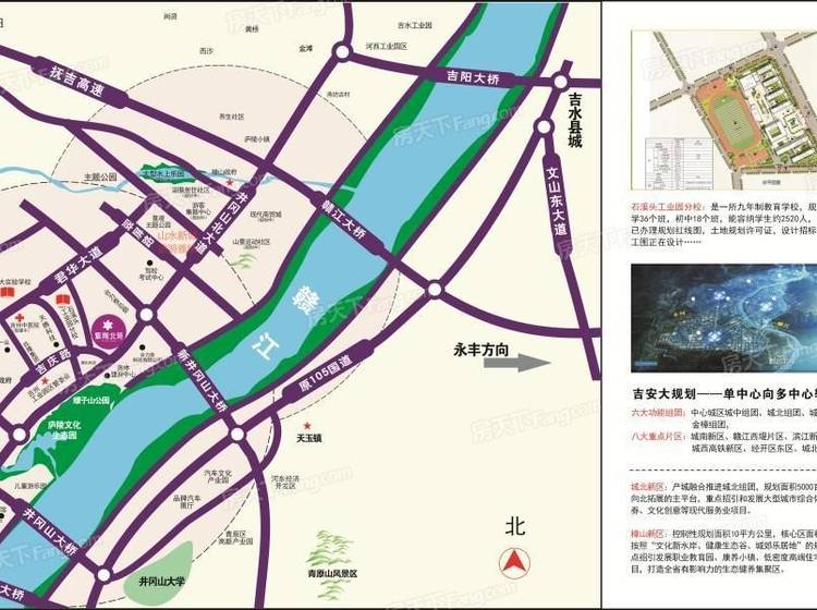 紫荆北苑位于井冈山北大道与吉庆路交汇处(摩比科技产业园对面),占地面积38296平方米,建筑面积13.6万平方米,其中居住建筑面积96246平方米,商业面积39760平方米,所有户型南北通透、明厨明卫、广阔江景,阳光鲜氧、公园绿地,定义的新城市生活范本。 紫荆北苑为圆心,半径2公里范围内,西靠天腾综合楼、吉州工业园服务中心、玖隆大厦、北大井冈山实验学校;东接新井冈山大桥、吉泰工业走廊;南望螺子山生态公园,北与CLD中心为邻;中国铁塔集团、江西合力泰、商贸经济管理学校尽在咫尺,此区域行政、机关、事业单位云集,求学、购物、就医十分便利,吉庆路沿线机关、商业、交通设施俱全,中心已经形成,伴随城市的高速发展,一跃成为未来城北的主线! 城北新区石溪头工业园学校(规建中),幼儿园+九年制公立学校,预计招生规模达到6000人,师资力量超过100人,学校的落成将紫荆北苑变成名副其实的“学府地区”,此区域将来也是城市高素质人群聚集之地。 北苑1号楼(商业) 井冈山大道通南北,吉庆路贯东西;紧邻新井冈山大桥、高科技产业园区,汇集两条城区快速路;路网环绕、畅行城北新区。 井冈山北大道、新井冈山大桥将连通城北新区和河东经济开发区——真正的城市快速路,极大的方便人们的出行。 紫荆北苑1号楼二期规建为商业大厦,1-3楼为商业服务,4—17楼为服务型公寓,1号楼占据井冈山北大道,畅享便捷路网,优质配套,坐拥区域。