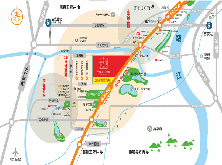 王府·中环广场,总建筑面积约32万平方米,由吉安市东方伟业置业有限公司与北京王府井集团联合打造,聘请绿城物业、中建集团、深圳规划设计院、深圳瑞和装饰、世联行等国内一线团队联袂巨献,涵盖王府公馆、王府商业街、王府井购物中心、王府·半岛酒店。王府公寓等多元业态的大型城市综合体,以时尚诞生地、娱乐集结地、爱情摩天轮、家庭俱乐部的情境体验,打造一站式购物天地,成为赣中区域商业的新坐标。