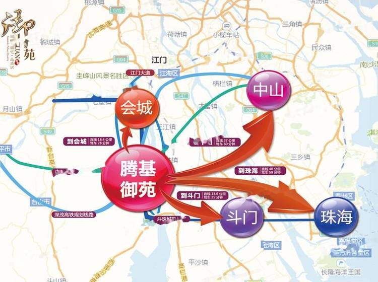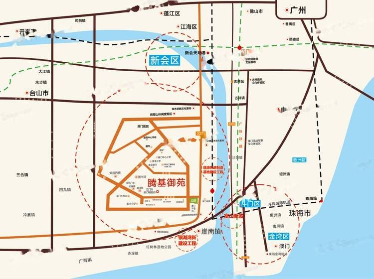 腾基御苑所在崖西地理位置优越,位于银洲湖新城南部,银湖湾历史文化风情圈和临港先进制造业基地核心位置。东邻珠海特区,南连古兜温泉度假区,西靠北峰山国家森林公园,北接新会城区,处于崖门镇中心地带,紧邻贯穿全镇的S271省道。未来西部沿海高速、台恩高速、中开高速与江肇高速南延线、珠三角环线轻轨将形成三横两纵的交通网。项目附近有幼儿园至初中,崖西中心市场,崖西医院,文化中心,崖门图书馆,银行,超市等配套。