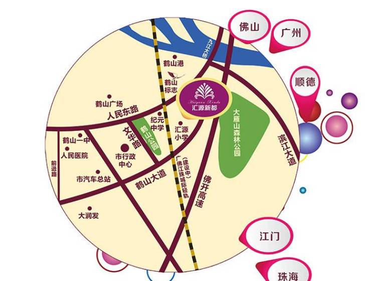 奥园汇源新都位于鹤山大道与人民东路交汇处,325国道、广佛、佛开、江珠等高速路网纵横互通。30万㎡大型品质生活社区,6万㎡园景,东观大雁山,北望西江,南靠鹤山公园,优越的自然环境! 周边完整配套,幼儿园、初中、高中一应俱全,鹤山中医院、鹤山广场、鹤山公园等市政配套!大型地下停车场,人车分流智能物业管理,便捷您的小区生活;多样户型、高利用率,户户南北对流。