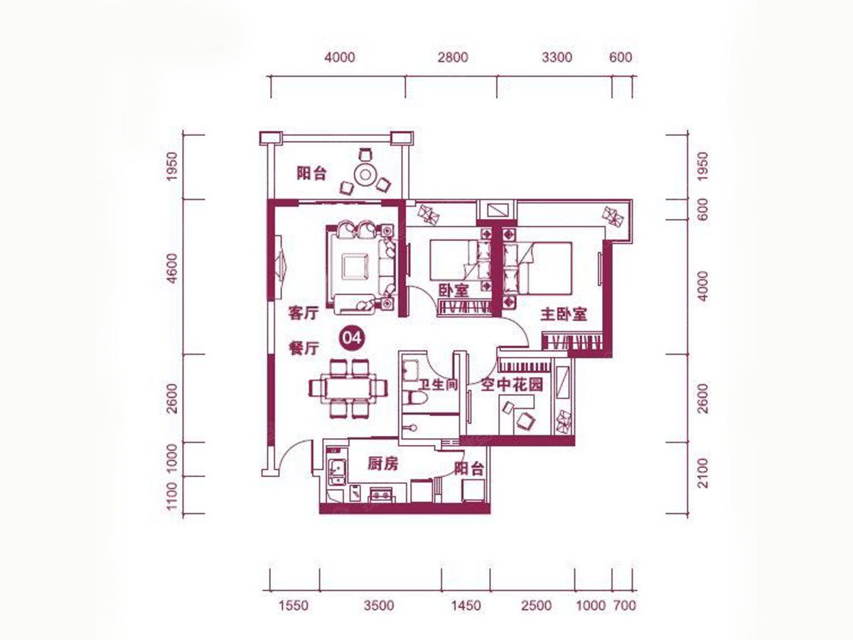 2室2厅1卫-26幢04户型