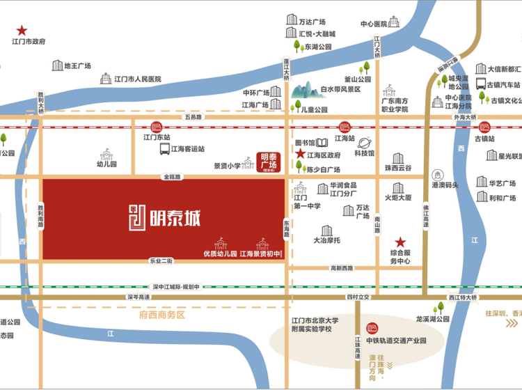 项目地块紧邻广珠轻轨江门站出口位置,到珠海、广州、顺德实现40分钟生活圈, 区位及交通优势十分明显。