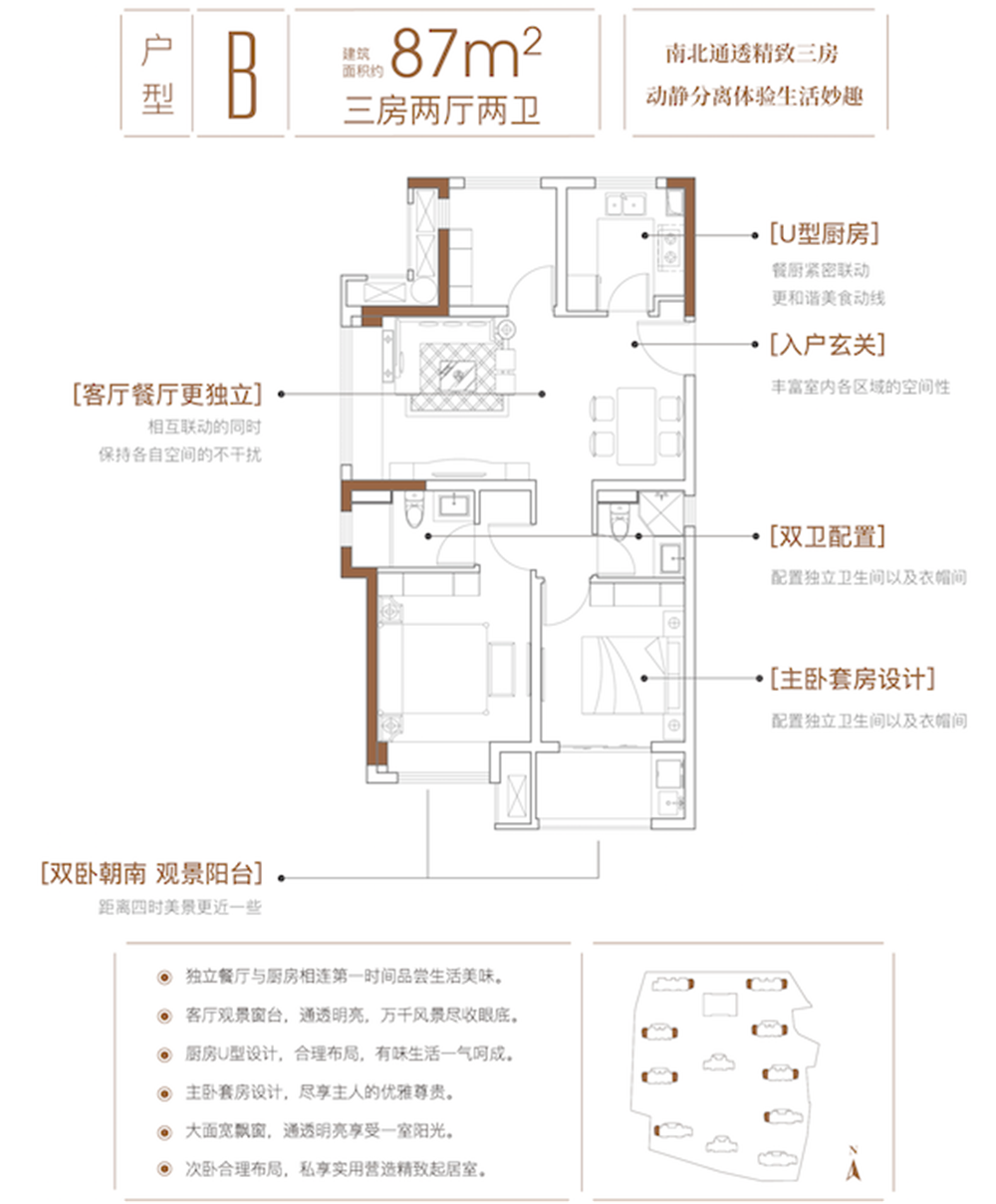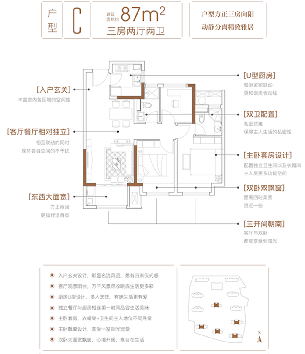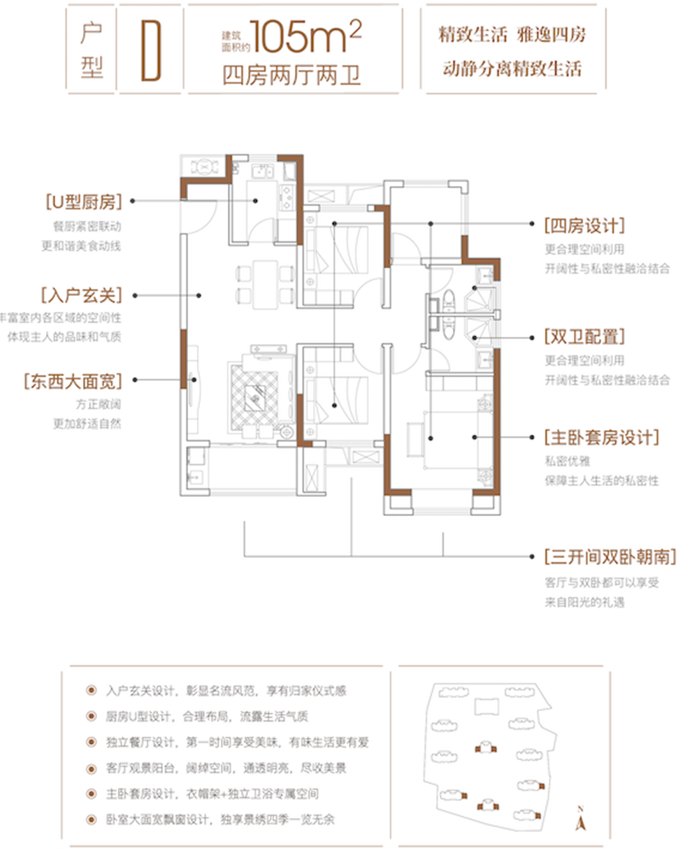 本项目三面环水,方便静谧;建筑采用美式大都会风格,尊享体验。十字景观中轴,南北两个中心花园,风景优美;45m超宽楼间距,采光充足;环形夜光跑道,温馨浪漫。