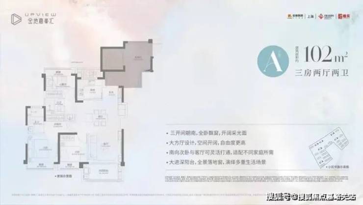 金地嘉峯汇官方售楼处电话:400-8824-198 VIPLINE✔✔✔【官方发布】A户型是建面约102㎡3房2厅2卫,该户型三开间朝南,采光效果上佳。大方厅设计,空间开阔自由度更高。南向次卧和客厅可灵活打通,适配不同家庭所需;大进深阳台+全景落地窗,让室内的通透性和视野可圈可点。