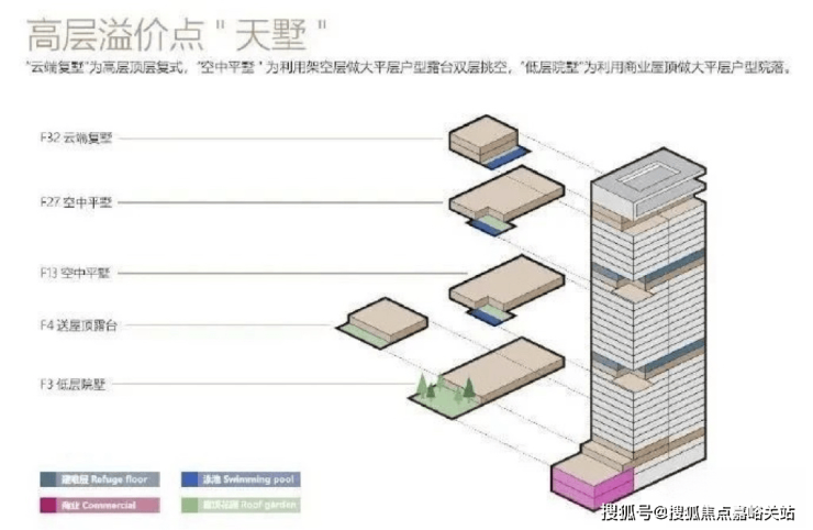 叠拼面积段约195-310㎡,分为1-2F下叠、3、4、5F为中间的平层面积236㎡,6-7F为上叠,计56套。