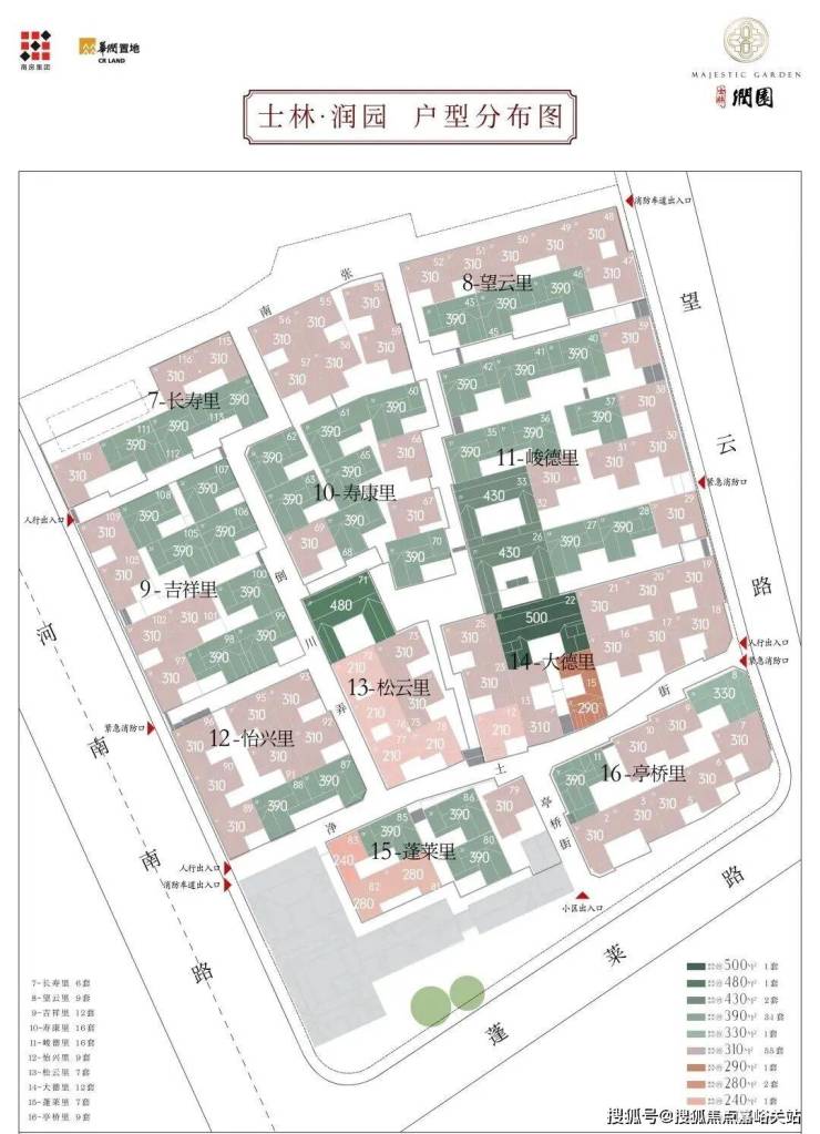 合院地上三层,面积段约270-500㎡,计合院82套。
