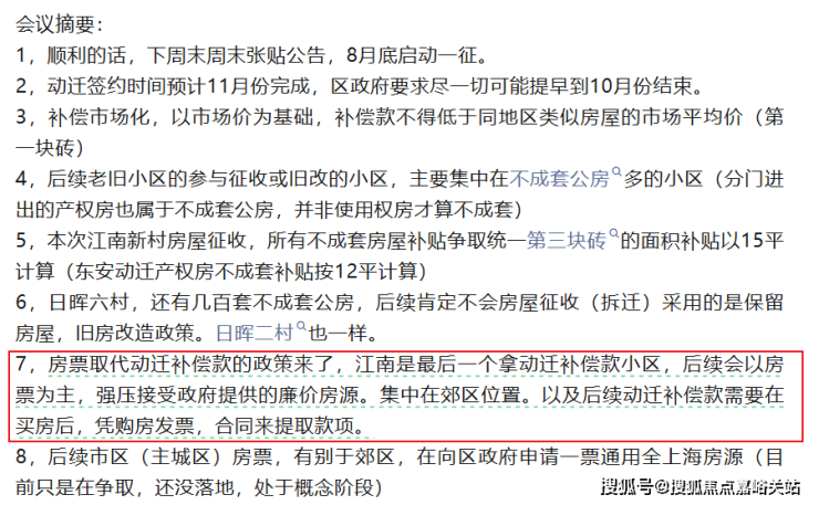 8月份市场流传出一份徐汇江南新村的动迁会议纪要,其中提到了“江南新村将是最后一个拿动迁补偿款的小区,后续以房票为主。”