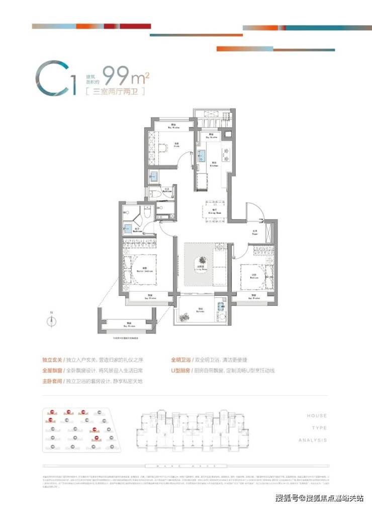 建面约99㎡三房:该户型是典型的飞机格局,很大程度上提高了使用率