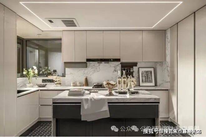 超大尺度的中西岛台,既符合中式烹饪的实用逻辑(预留足够操作台面),又能承载西式社交(朋友小聚时在岛台品酒聊天),让厨房从“单一做饭空间”变成“生活场景发生器”。