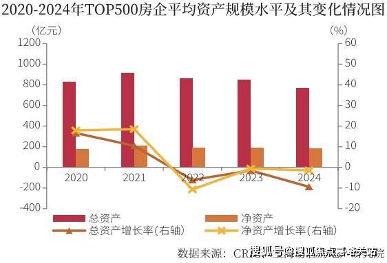 2024年,TOP500房地产开发企业总资产均值为768.02亿元,同比下降9.42%;净资产均值为185.36亿元,同比下降1.49%。2024年TOP500房企继续缩表,总资产、净资产规模继续下降,且同比降幅较上年有所扩大。