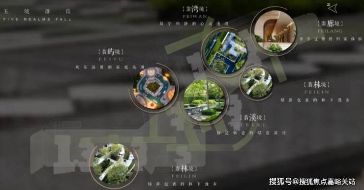 规划了 “翡色五境”五大空间氛围,匠造融入时光、人文海派、自然与艺术、家庭与邻里的 “四轴、三园、五区、一所”四大功能空间。
