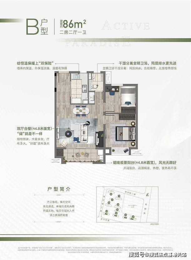 客厅与餐厅连为一体,约4.8米大面宽设计,外连观景阳台,拥揽四季的人生景致。