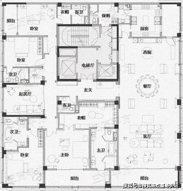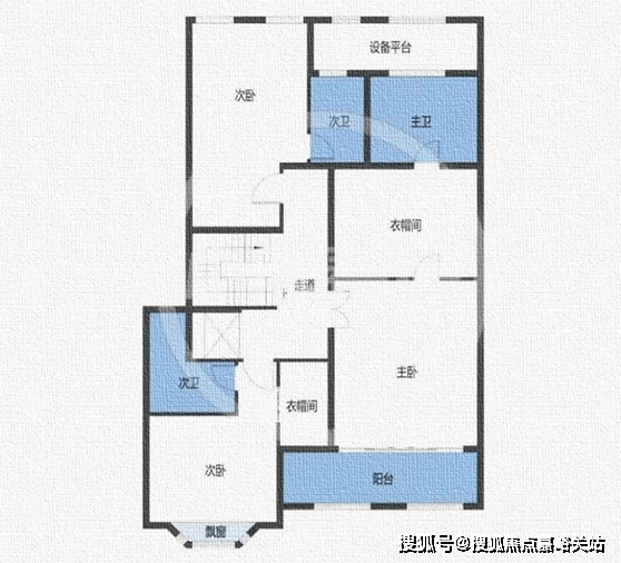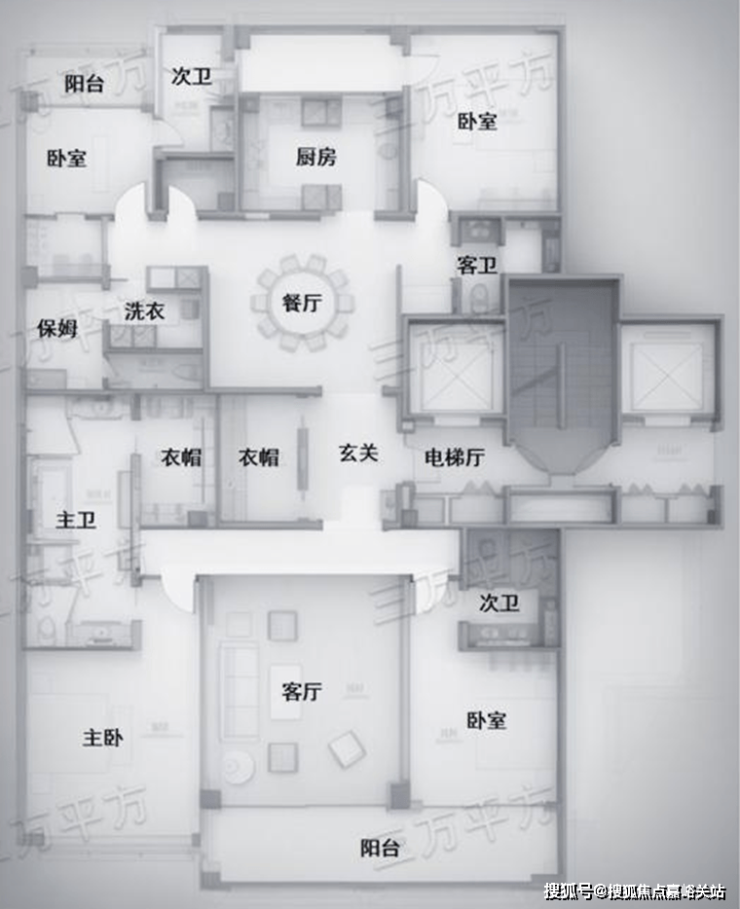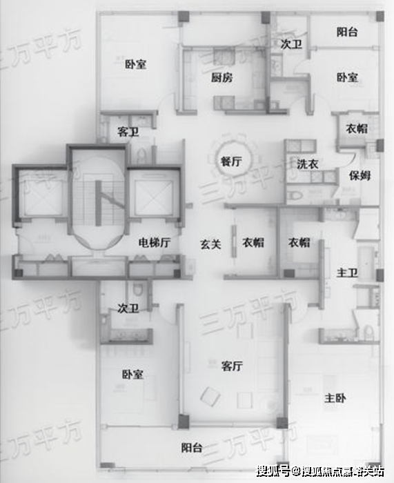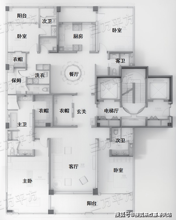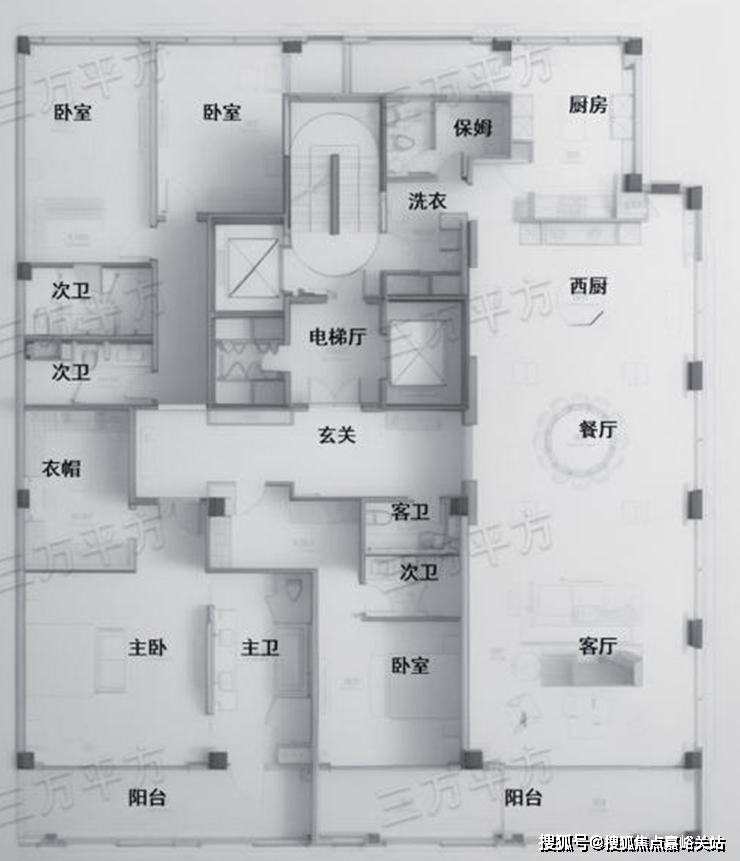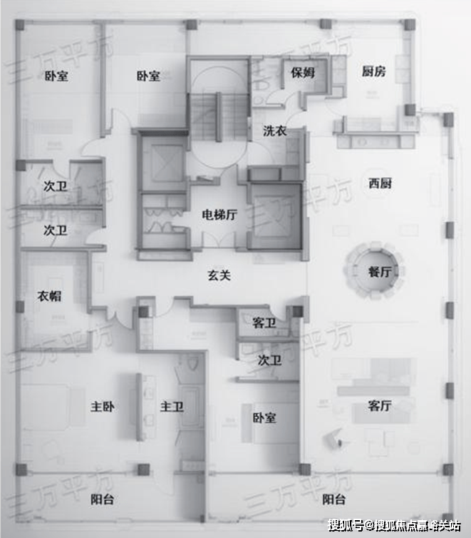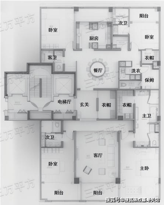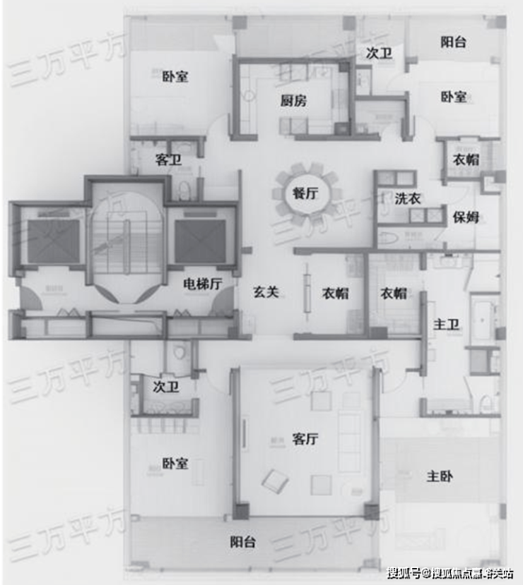 整体布局和G3反 320㎡户型相同,只是主卧和北侧次卧阳台做了一些缩减。