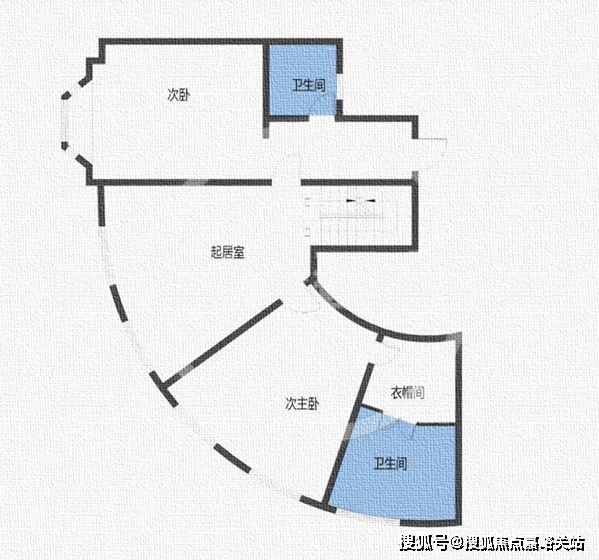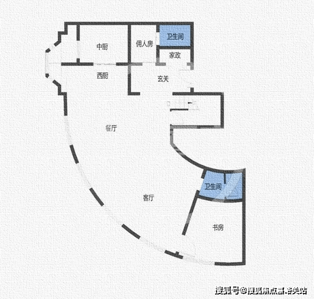 西侧次卧和客厅拥有公共加长阳台,卫生间数量很多,几乎都是无直接通风采光条件,使用上会略有不便。