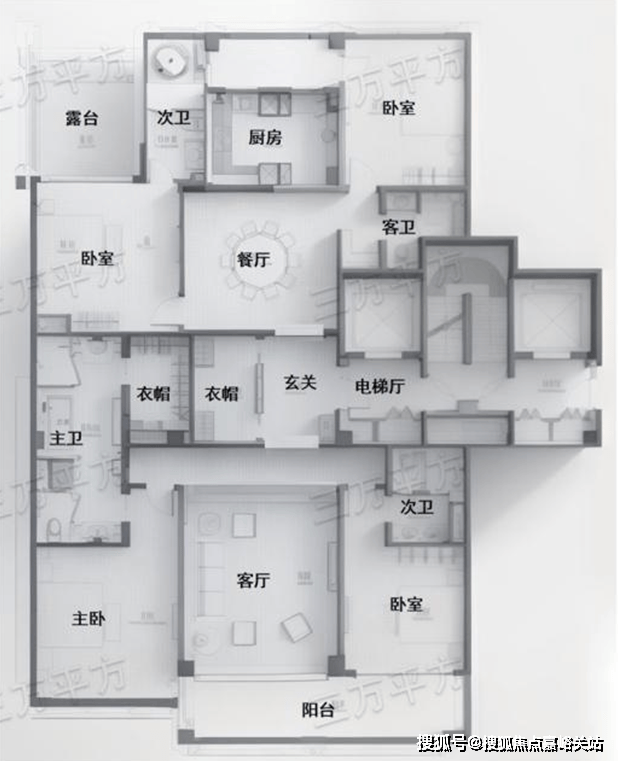 整体格局与G4有些相似,只是北次卧的阳台变成了露台,并且无保姆房和洗衣房。